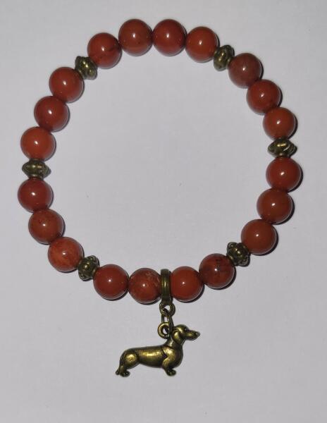 Jáspis ásványból készült női karkötő bronz színű díszítőkkel és tacskó medállal A gyöngyök mérete: 8 mm-es ásványgyöngyök Rugalmas, gumis ékszerdamil alapra készült A Jáspis alapvetően tisztítja és átalakítja a fizikai testet, és védettséget biztosít viselőjének. Önzetlenségre és szerénységre nevel. Gondoskodik a védelemről, földeli az energiákat és