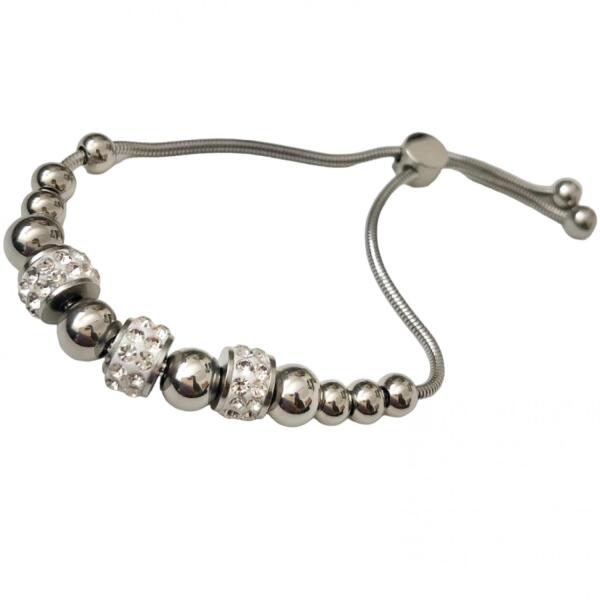 Maggie Karkötő Modern Maggie karkötő verhetetlen áron. Cirkónia ékkövekkel díszített. Az ékszer nem tartalmaz nikkelt, ezért érzékeny bőrű emberek is viselhetik. Tulajdonságok: A karkötő hossza: max. 24cm (húzással állítható) A díszítés mérete: 8cm x 0,9cm Szín: Ezüst Anyaga: Nemesacél