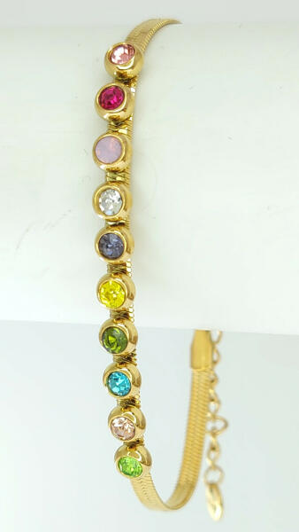 Aranyszínű nemesacél (316L) lapos karkötő, melyet színes cirkónia kristályok tesznek csillogóvá. A kristályok ragasztott, peremezett foglalatban helyezkednek el. Tartós, minőségi anyagának köszönhetően nem feketedik, nem színezi a bőrt, mindennapi viseletre is alkalmas. Antiallergén ékszer. 14K arany színben kapható. Karkötő szélessége: 3 mm. Karkötő hossza: 16,5 cm +
