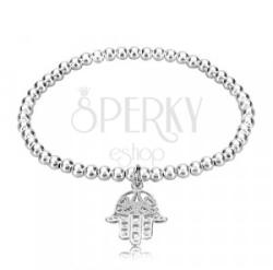 Rugalmas karkötő 925 ezüstből. Az alapját egy átlátszó, rugalmas gumiszalag adja, amelyre fényes golyók vannak felfűzve. A golyókat egy medál egészíti ki, amely a Hamza védőszimbólumot - Fatima kezét - ábrázolja. A kéz díszesen metszett. A tenyéren található ornamentumokat az elüslő részen apró pontok díszítik. A díszes rész mérete: 16 x 22 mmA golyók átmérőj