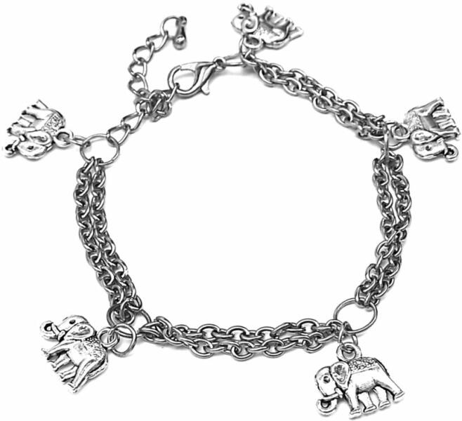 Elefánt os charmos karkötő, 5 charmmal. Paraméterek: Charm mérete 1,3 cm. Anyaga fémötvözet, karkötő anyaga rozsdamentes acél. Karkötő mérete 17+5 cm. (Ha ettől eltérő méretet szeretnél, rendeléskor a MEGJEGYZÉSBE írd be. )