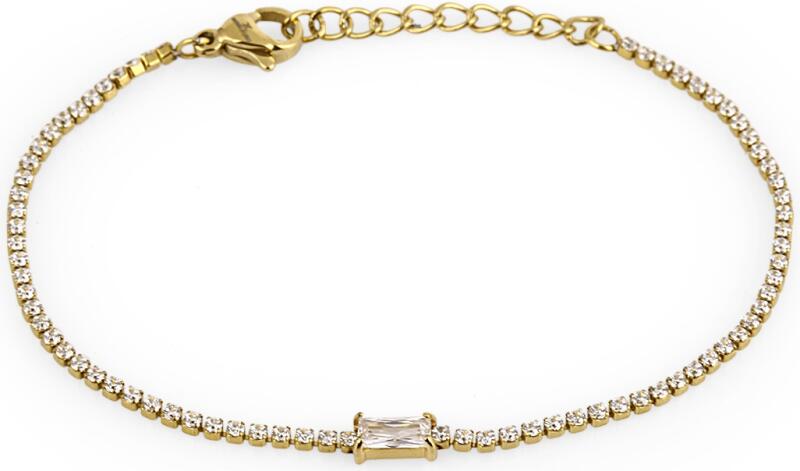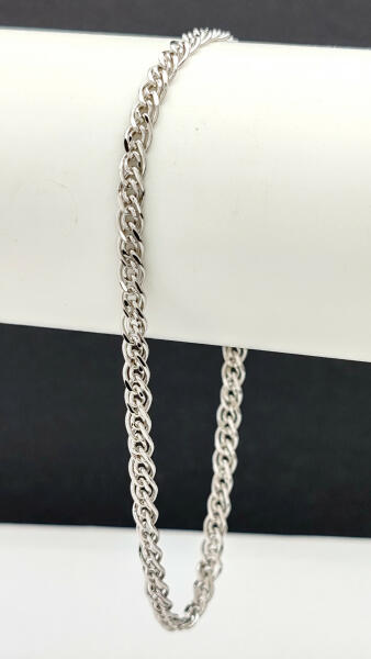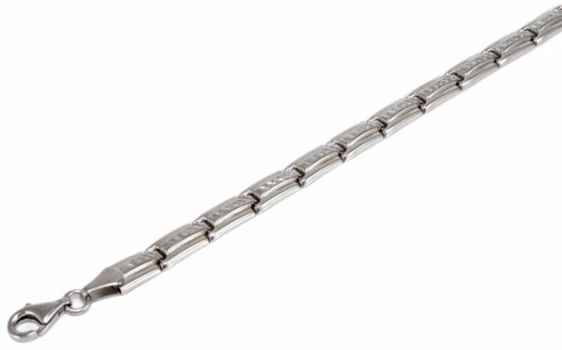 Modern stílusú, igen kedvelt fazonú, ródiummal bevont, csillogó véséssel díszített, üreges szemekből álló stiftes arany karlánc.