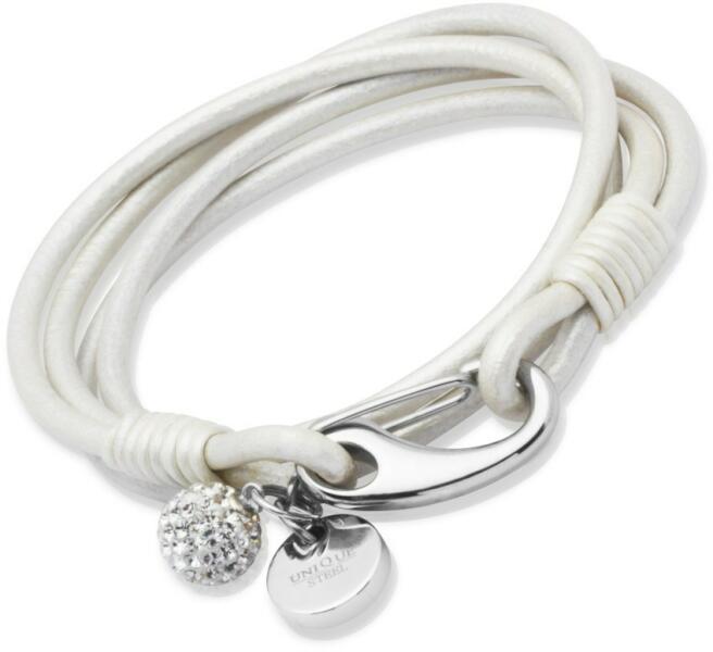 Rozsdamentes acél és bőr karkötő. Természetes bőr és rozsdamentes acél. Gyöngyházfehér szín. Különleges díszek a karkötőn: kristálygömb és medál Biztonsági zár. 19 cm-es méretben. Cikkszám : B152PE Szín : Gyöngyházfehér Karkötő anyaga : Rozsdamentes acél és bőr Méretválaszték : 19 cm Nikkelmentes : Igen Vízállóság : nem vízálló Garancia : A termékre eg