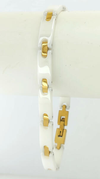 Aranyszínű nemesacél betéttel díszített fehér kerámia karkötő. A nemesacél és kerámia előnyös tulajdonságainak köszönhetően nem törékeny, nem kopik, nem feketedik. A kerámia teljes anyagában színezett, nem veszít fényéből. Tartós, minőségi antiallergén ékszer. 14K arany színben kapható. Karkötő hossza: 18,5 cm. Karkötő szélessége: 6 mm. Igény esetén rövi