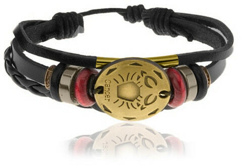 Bőr karkötő vékonyabb, szélesebb és fonott szintetikus bőr sávval barna színben. A szélesebb sávon kerek fém tábla található sárgaréz színben, RÁK csillagjeggyel és "Cancer" felirattal. A karikát fa és fém gyöngyök övezik. A karkötő hossza zsinór segítségével állítható és fa golyókkal végződik. Szélesség: 25 mmHossz: 170 mmHosszabbítható rész: kb 70 mm