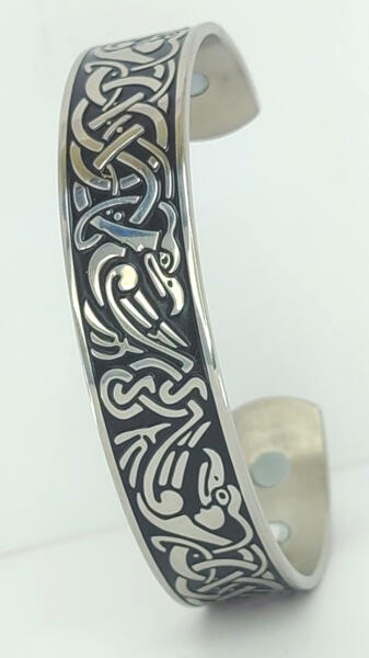 Ezüstszínű nemesacél (316L) mart viking motívumokkal díszített nyitott karperec. A karperec belső oldalán hat darab mágnes található. Tartós, minőségi ékszer, nem feketedik, nem színezi a bőrt. Mindennapi viseletnek is tökéletes választás. Antiallergén ékszer. Karperec belső átmérője: 64 mm ( minimálisan állítható ). Szélesség: 15 mm. A nemesacél ékszerek rendk