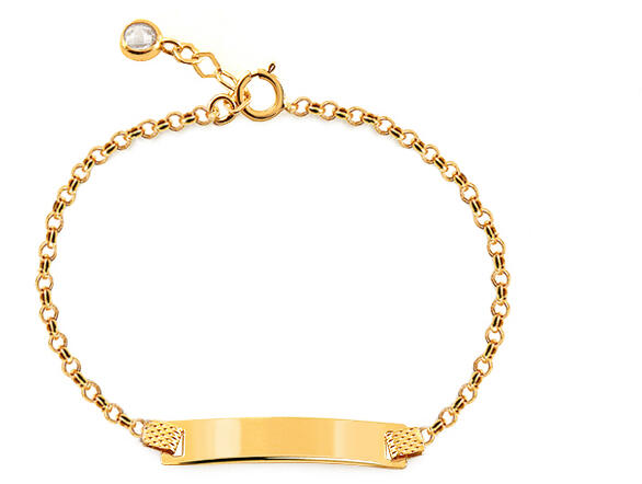 Tizennégy karátos aranyból készült gyermek karkötő. Lemezzel ellátott, amely alkalmas dátum vagy a gyermek nevének gravírozására. A Rolo lánc nagyon kényelmes sima és kerek láncszemeinek köszönhetően. A zárszerkezete rugós karika, és számos hosszabbító szemmel dúsítva, amelyeket tiszta cirkónia díszít.
