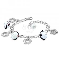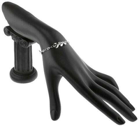 A 925 ezüst karkötőt kétféle elemek alkotják. Csillogó bemetszésekkel díszített, keskeny cseppek váltakoznak szív körvonalakkal, amelyeket átlátszó, csiszolt cirkóniákból álló ívek egészítenek ki. A karkötőnek állítható hossza és delfinkapcsos zárszerkezete van. Felülete ródiummal kezelt. Karkötő szélessége: 6 mmKarkötő hossza: 165 mmHosszabbítható rész: 2