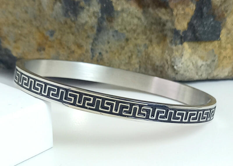 Ezüstszínű nemesacél (316L) karperec melyet mart görög minta és fekete tűzzománc díszít. A karperec teljes kerülete díszített. A karperec kinyitható a könnyebb felhelyezés érdekében. Minőségi, tartós anyagának köszönhetően akár mindennapi viseletnek is alkalmas. Antiallergén ékszer. Szélessége: 6 mm. Átmérője: 60 mm. A nemesacél ékszerek rendkívül népszerűek