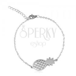 Az ezüst színű sebészeti acél karkötő állítható hosszúságú és ferdén összekapcsolt ovális szemekből álló láncból tevődik össze. A lánc közepén egy fényes, lapos ananász alakú medál van odafogatva, vágatokkal díszítve. Delfinkapoccsal záródik. Szélesség: 1,8 mmHossz: 190 mmHosszabbítható rész: 30 mmTeljes hossz: 220 mm (+/- 5 %)Medál méretei: 25 x 12 mm