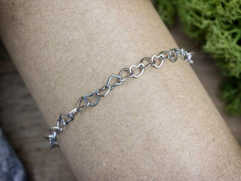 Nemesacélból készült divatos, tartós, antiallergén karkötő, amely szív alakú szemekből áll. Delfinkapoccsal záródik. A képen látható charmokat külön tudod megvenni, a karkötőt charmok nélkül küldjük. Ez a karkötő jól kombinálható charmokkal, de medálok nélkül is szépen mutat.