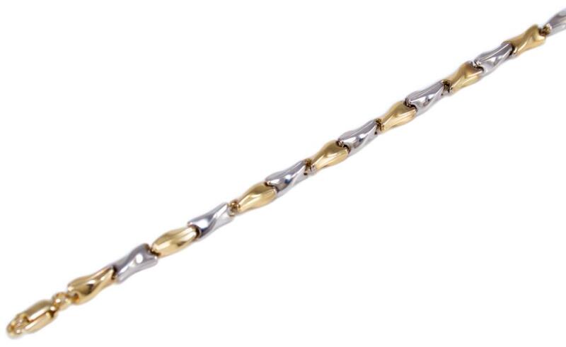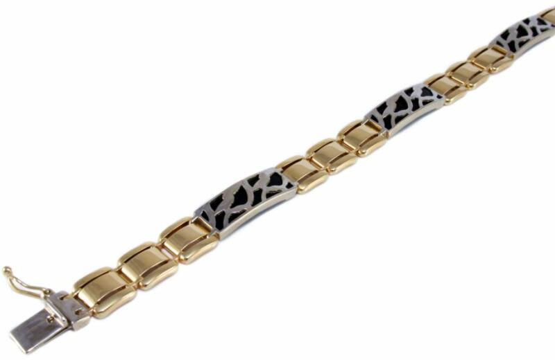 Modern stílusú, ródiummal és áttört mintában fekete műtermékekkel díszített stiftes férfi arany karkötő.