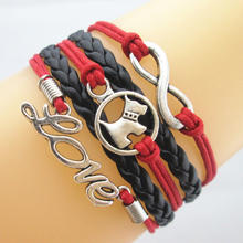 Többfle kombinációban kapható ez a típusú fonott bőr karkötőnk, amelyen a végtelenséget szimbolizáló medál, Love felirat, valamint egy kutyus medál is díszeleg.