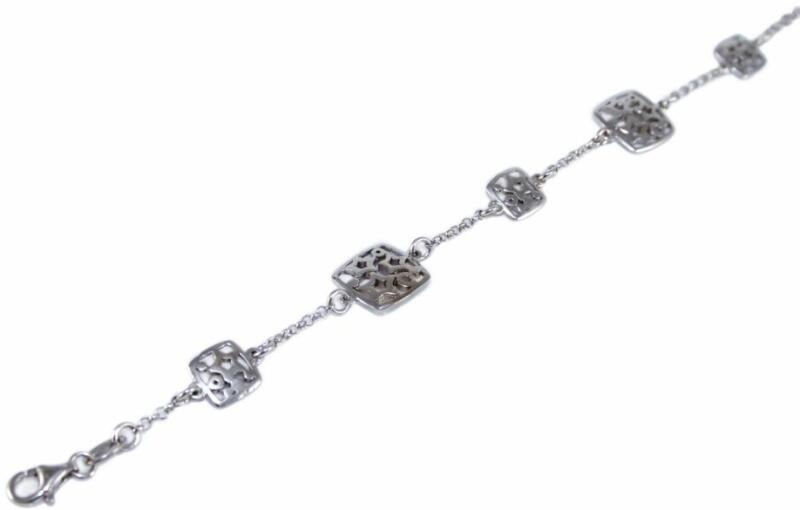 Modern stílusú, áttört mintájú négyzetes betétekkel kombinált, ródiummal bevont anker ezüst karkötő.