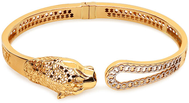 Modern ovális arany karkötő kombinált aranyból. A karkötő közepe egy gepárd feje, a farokutánzatot fehérarany mintával díszítik. A karkötő kerülete 20 cm.