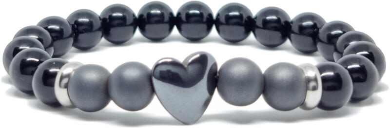 Kiváló minőségű valódi ónix ásványból készült ásvány karkötő. Az ónix karkötő mély fekete árnyalatával és erőteljes megjelenésével stílusos kiegészítő, amely magabiztosságot és stabilitást sugall viselőjének. A karkötő valódi, ónix, matt hematit 8-9 mm ásványból és nemesacél köztes és hematit szív dísszel készült. Az ásvány, karkötő formában v