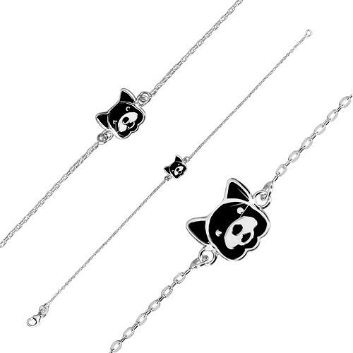 925 ezüst karkötő egy rögzített medállal. A láncot lapos ovális szemek alkotják, amelyek egymásra merőlegesen forrasztottak. A medál egy kutyafejet ábrázol. Elöl vésett és fekete zománccal borított. A kutya füle, szeme, orra és szája kivehető. Hátsó felülete sima és fényes. Delfin kapcsos kivitel. A díszes rész méretei: 13 x 9 mmA lánc szélessége: 1,1 mmA karköt