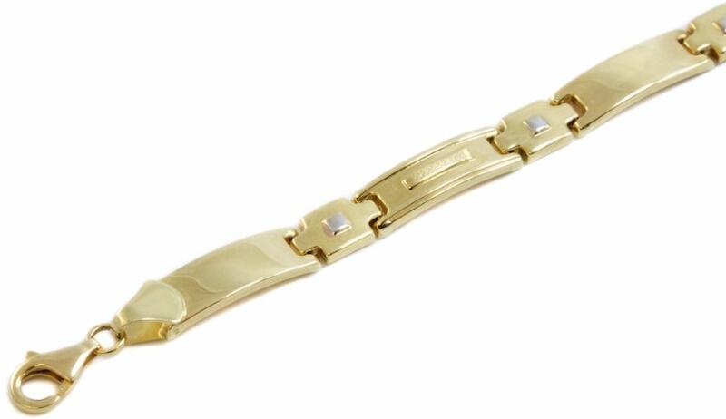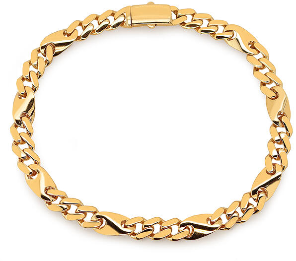 Modern stílusú, méreténél fogva igen mutatós, masszív kialakítású, ródiummal díszített szögletes profilú "barakka jellegű" arany karkötő.