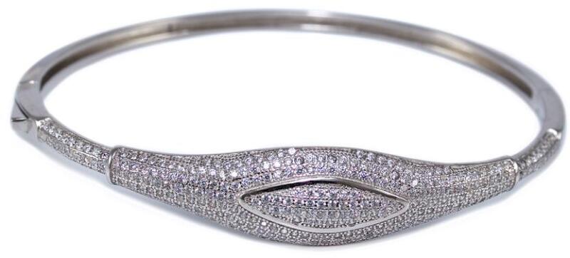 Modern stílusú, elegáns, középre szélesedő felső részén apró cirkónia kövekkel ékített, ródiummal bevont, praktikusan nyitható ezüst karperec.