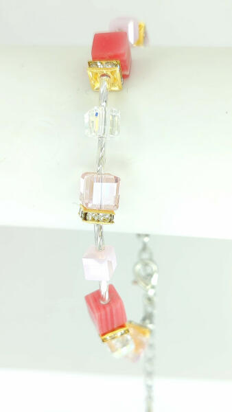 Szemet gyönyörködtető sötét, halvány és opálos rózsaszín és fehér üveg kristályos karkötő, melyet fehér cirkónia kristályok tesznek még csillogóbbá. A kristályok nemesacél sodrony alapon helyezekdnek el, fehér üveg kristály köztes szemekkel rögzítve. A cirkónia kristályok ragasztott, szorított foglalatban helyezkednek el. Tartós, minőségi anyagának köszönhet
