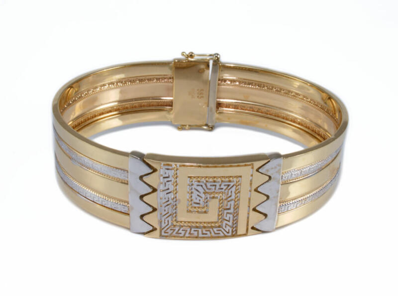 Modern stílusú, görög mintával és ródiummal díszített, szögletes profilú, arany férfi karperec.
