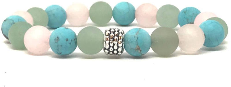 Egyedi ásvány karkötő A 8mm-e Rózsakvarc, Türkiz és Aventurin ásvány golyókból készült egyedi ásvány karkötő speciális gumis damilra van fűzve, fém köztes díszítéssel. Amit a Rózsakvarc ásványról tudni kell: A festetlen rózsakvarc az egész világos, szinte áttetszőtől, a ködös középrózsaszínig terjed. Az egyik legnépszerűbb kövek egyike, amely szépséges
