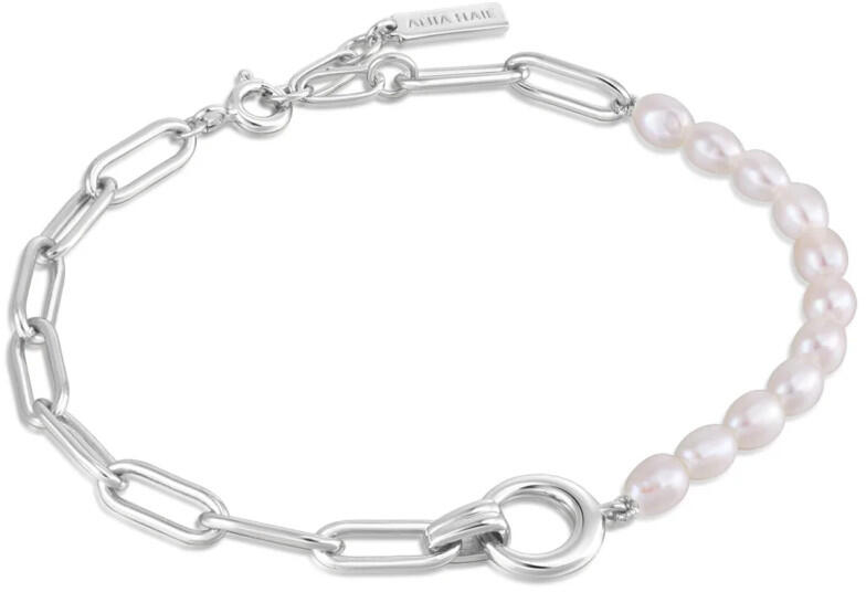 A karkötő finom ezüst színű acél láncból áll. Középen hat fehér gyöngy van, amelyek szilárdan vannak rögzítve a láncok között. Homár karmos rögzítés. Gyöngy mérete: 6 mm A karkötő szélessége: 1,9 mm Hossz: 180 mm Hosszabbító lánc: 30 mm Teljes hossz meghosszabbítással: 210 mm (+/- 5%) Az ár egy darabra vonatkozik.