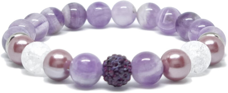 Kiváló minőségű valódi ametiszt chevron ásványból készült ásvány karkötő. Az ametiszt karkötő finom lila árnyalatával harmóniát és nyugalmat sugároz, miközben az ásványt hagyományosan a tisztánlátás és belső egyensúly jelképeként viselik. A karkötő valódi ametiszt, roppantott hegyikristály, shell pearl (lila) 8-9 mm ásványból és nemesacél rondella, és d