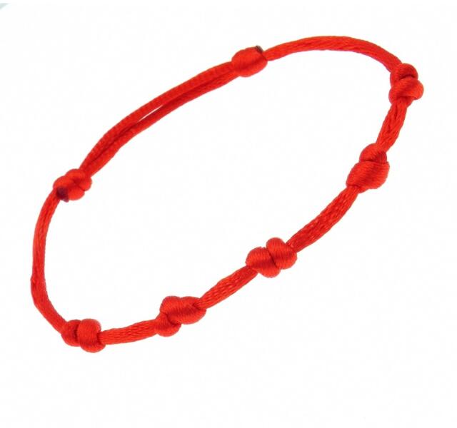 Piros zsinóros 7 csomós védelmező karkötő, mely testi, lelki védelmet nyújt viselőjének, óv az ártó tekintetektől gonosz szellemektől és a saját féltékenységünktől. A karkötőn 7 csomó található, ezekből 2 csomó csúszó csomó, ami segítségével méretre állítható. A karkötő csomagonként (1db/cs, 3db/cs, 6db/cs, 10db/csomag) kedvezménnyel, akár 779Ft/ darab