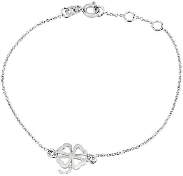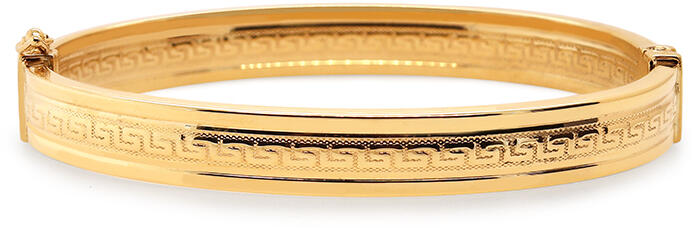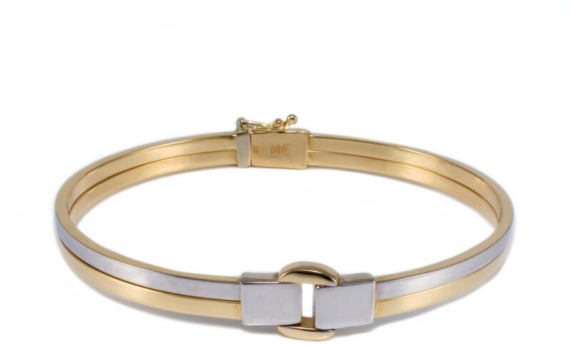 Modern stílusú, kedvelt fazonú, ródiummal díszített, stiftes, üreges, mutatós arany karperec.