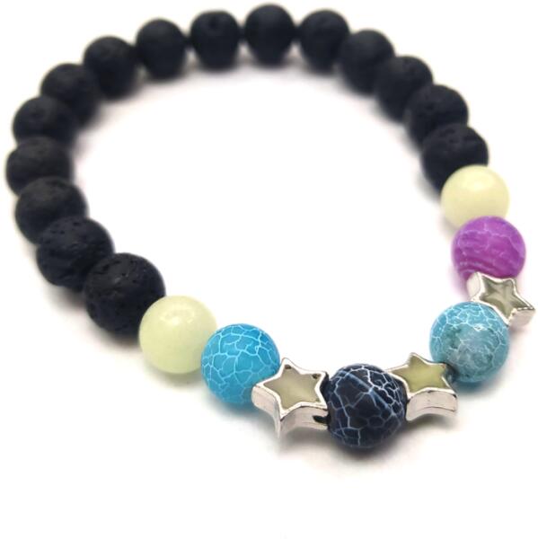 Természetes kő karkötő csillag motívumokkal, sötétben zölden világít. A színes gyöngyök eltérő színűek lehetnek. Hossza: 19 cm, rugalmas. Egy jól megválasztott ékszer öltöztet, feldobja a napodat, valahányszor ránézel, jobb kedvre derülsz. A színekkel és anyagokkal manapság könnyű variálni a különböző stílusokat, nem kell ragaszkodni a hagyományos szettekhez,