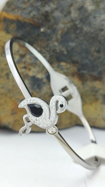 Ezüstszínű nemesacél (316L) karperec, melyet fehér cirkónia kristályok tesznek csillogóvá és hattyú minta díszít. A kristályok ragasztott foglalatban helyezkednek el. A karperec kinyitható ( rugós ) a könnyebb felhelyezés érdekében. Minőségi, tartós anyagának köszönhetően akár mindennapi viseletnek is alkalmas. Antiallergén ékszer. Karperec szélessége: 2 mm. Hattyú