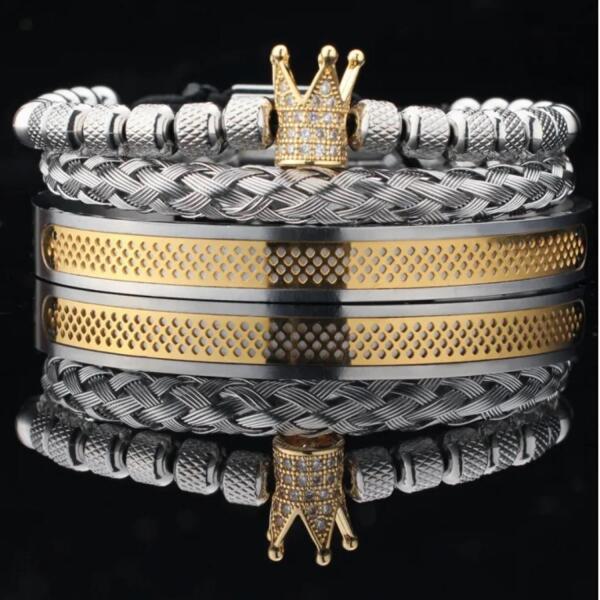 Eskame karkötők Az Eskame karkötők a kifinomult dizájnt a luxus érzetével ötvözik. Ez a háromrészes szett különböző dizájnú karkötőket tartalmaz. Együttesen harmonikus és elegáns egységet alkotnak, amely minden csuklón magára vonja a figyelmet. Ezek a karkötők tökéletes választás azok számára, akik szeretik a modern stílust a királyi eleganciával párosítani. H