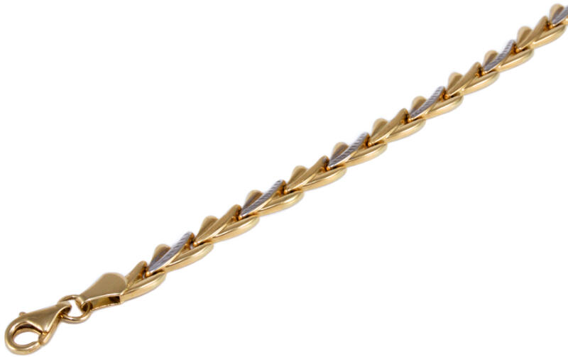 Modern stílusú, kedvelt fazonú, ródiummal és véséssel díszített, stiftes, üreges, mutatós arany karkötő.