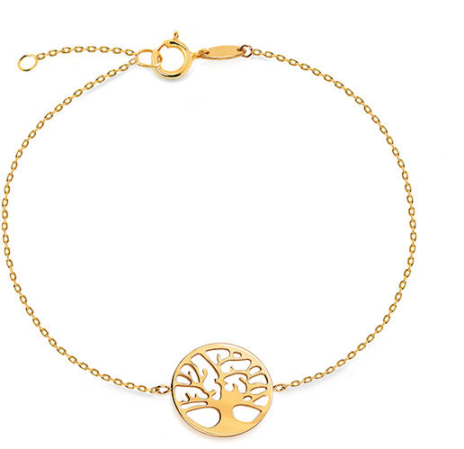 Az életfa - a teremtés és a halhatatlanság univerzális szimbóluma, elegáns karkötővel. Finomságának és sokoldalúságának köszönhetően valóban bármihez viselhető. A kerek medált az életfa díszmotívuma díszíti, és a fényes sárga arany kivitelnek köszönhetően kiemelkedik.