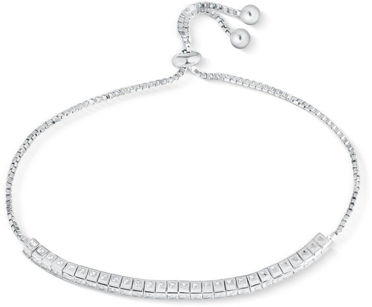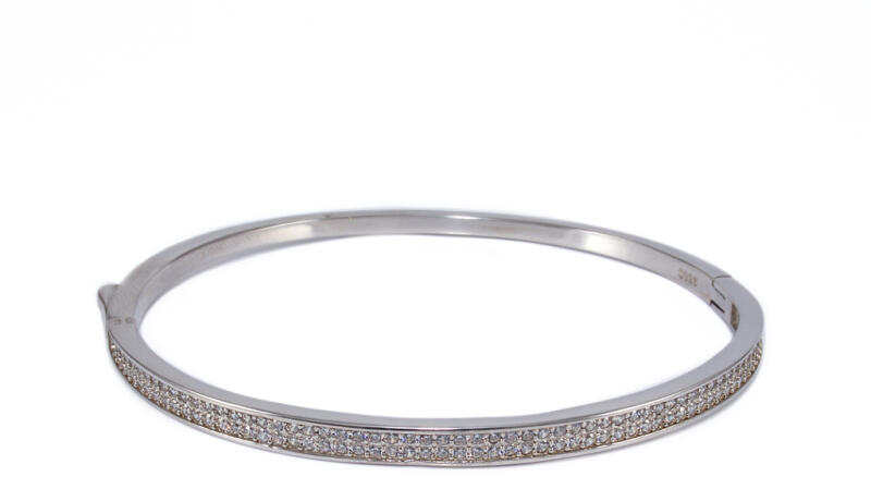 Modern stílusú, cirkónia kővel ékített, szögletes profilú, oldalán nyíló, ródiummal bevont ezüst karperec.