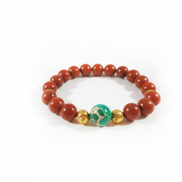 A jáspis és aurakvarc ásvány golyók gumira vannak felfűzve. Amit a jáspisról érdemes tudnod: Gyakori előfordulása és a földszínek széles skálája miatt a jáspist ősidők óta használják dísztárgyak és pecsétek készítésére. Mágikus ereje miatt is nagyra értékelték. Úgy hitték, hogy túlvilági szellemi cselszövések ellen véd és a szerelmi bánatot mérsékli. G