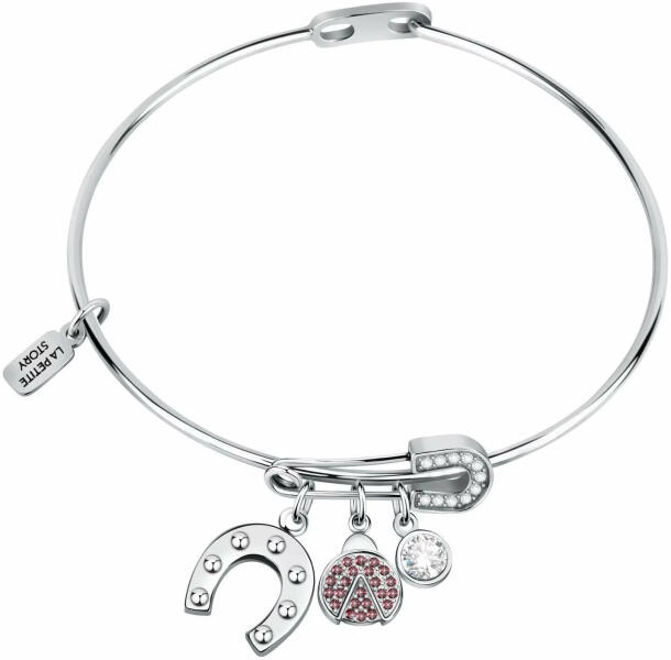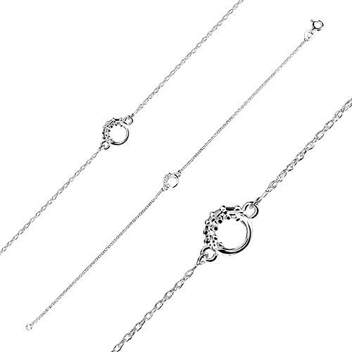 A karkötő 925 ezüstből készült, finom láncból és rögzített medálból áll. A lánc sűrűn kapcsolódó ovális láncszemekből épül. A medál alakja karika, középen nyitott. A félkörív külső és belső oldala apró pontokkal díszített. A karkötő zárszerkezete delfinkapcsos. A díszes rész méretei: 11 x 7 mmA karkötő szélessége: 0,9 mmA karkötő hossza: 190 mm (+/-