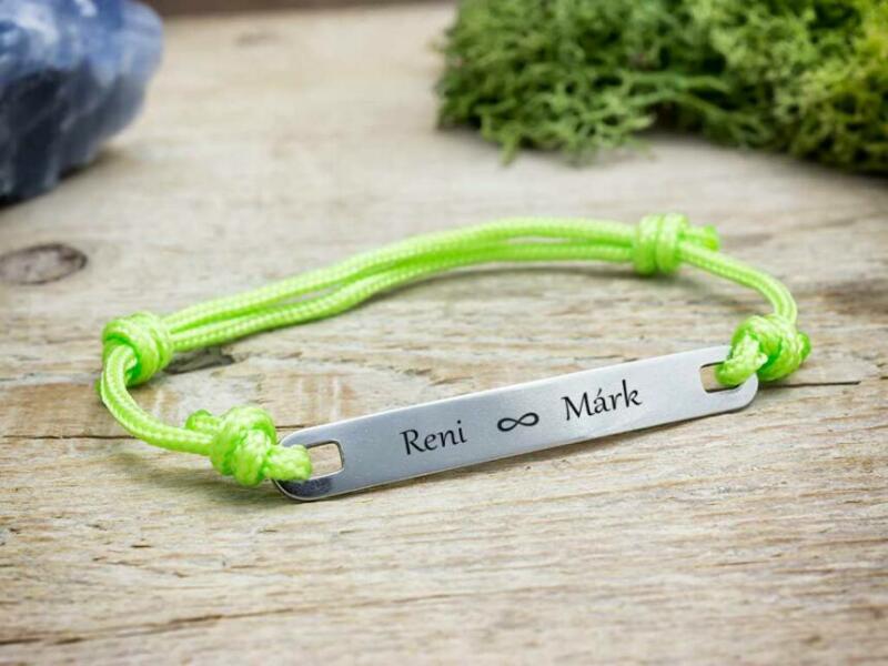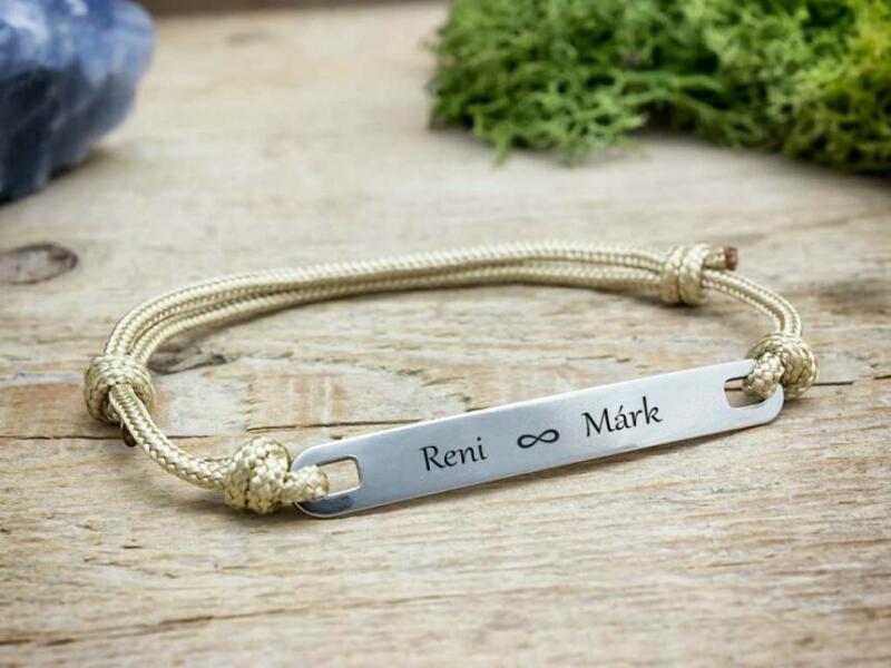 Ezt az egyszerű, de mégis egyedi karkötő ajándék ötlet ünket e gy microcord zsinór , és egy acél medál alk ot ja . A karkötőt egy lap alakú 49×6,3 mm-es méretű elegáns acél medál díszíti, amit gravírozunk , így személyesebbé téve az ajándékot . A nemesacél más néven orvosi fém medál nem allergizál , ezért fémre érzékenyeknek is bátran ajánljuk . Mindemelle