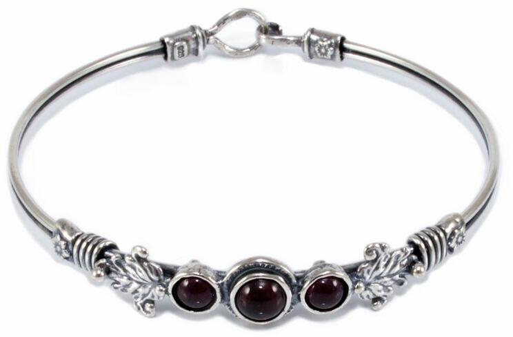 Modern stílusú, különleges, antikolással, virág és levél motívumokkal, valamint gránát kövekkel díszített ezüst karreif.