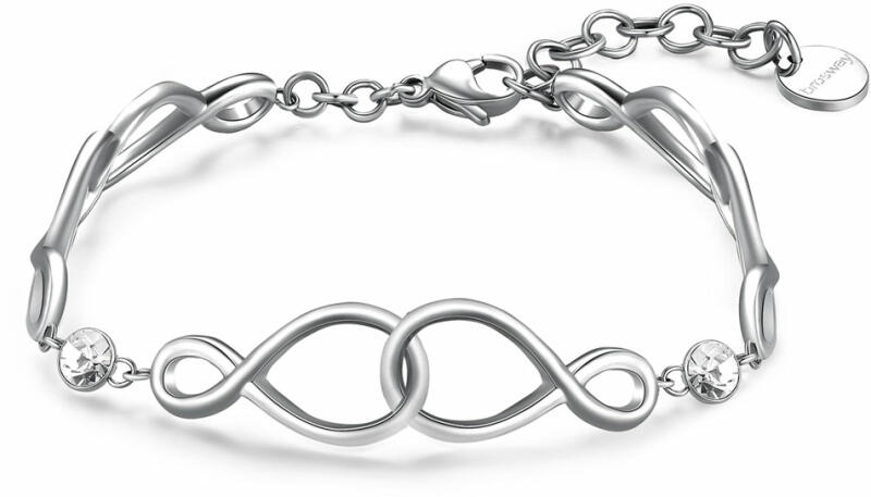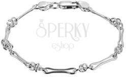 A sterling ezüstből készült karkötőt kétféle láncszem alkotja. A hosszabb, középen összeszűkített ovális szemek kis csontokra emlékeztetnek, megtekert karikákkal vannak összekapcsolva. Delfinkapoccsal záródik. A karkötő szélessége: 5 mmA karkötő hossza: 195 mmA karkötő súlya: 7 gFémjelzéssel ellátott.