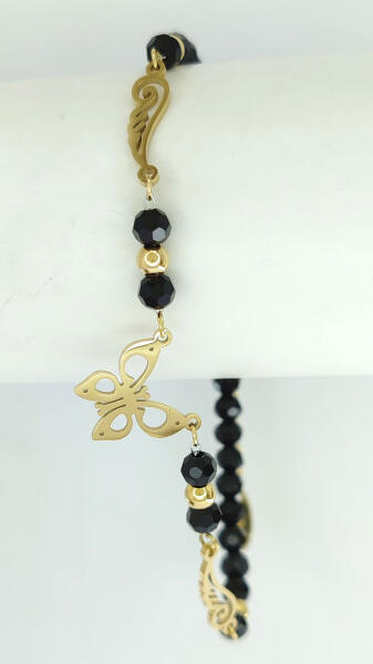 Aranyszínű nemesacél (316L) karkötő, melyet fekete acryl gyöngyök, pillangó és angyalszárny charmok díszítenek. Tartós, minőségi anyagának köszönhetően nem színeződik, mindennapi viseletre is alkalmas. Antiallergén ékszer. 14K arany színben kapható. Hosszúsága: 19 cm + 3,5 cm hosszabbító. Karkötő szélessége: 4 mm. Charmok mérete: 12 mm x 12 mm, 5 mm x 15 mm. A nem