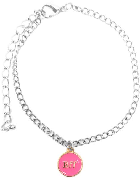 BFF pink charmos karkötő, best friends forever - legjobb barátok örökre. Paraméterek: Charm mérete 1,4 cm. Anyaga fémötvözet, karkötő anyaga rozsdamentes acél. Karkötő mérete 17+5 cm. (Ha ettől eltérő méretet szeretnél, rendeléskor a MEGJEGYZÉSBE írd be. )