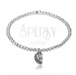 A 925 ezüst karkötő egy átlátszó, rugalmas gumiszalagból áll, amelyre sima, fényes golyók vannak felfűzve. A golyókat egy angyalszárny alakú medál egészíti ki. Az enyhén hullámos szárnyon lévő tollak díszesen metszettek és patinásak. A medállal szemben egy nagyobb golyó és egy kisebb karika található. A díszes rész mérete: 7 x 17 mmA golyók átmérője: 3 mm és 4