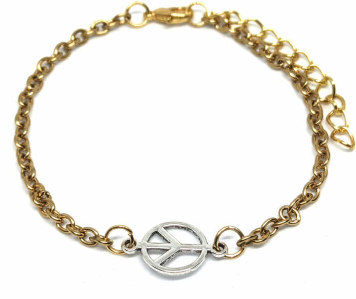 Békejel charmos karkötő, 1 charmmal. Paramé terek: Charm mérete 1 cm. Anyaga fémötvözet, karkötő anyaga rozsdamentes acél. Karkötő mérete 17+5 cm. (Ha ettől eltérő méretet szeretnél, rendeléskor a MEGJEGYZÉSBE írd be. ) Mindennapjainkat beárnyékolják a háborúk, harcok a világban, hozzánk is egyre közelebb. Közhely már a világbékére vágyni, ha szépségkirálynő