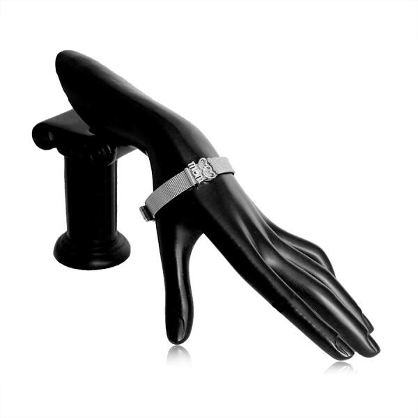 316L nemesacélból készült karkötő ezüst kivitelben. A karkötő két egymásba fonódó acél szívet és a "MOM" (anya) feliratot ábrázolja, az "o" betűre helyezett kis strasszkővel. A díszek mozgathatóak és cserélhetőek. Óracsattal záródik, a karkötő pántja hálós. Karkötő szélessége: 10 mm Karkötő hossza: 230 mm (+/- 5%) Kapocs hossza: 160 mm, 170 mm, 180 mm, 190 mm