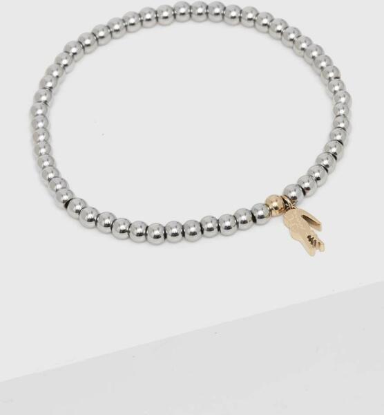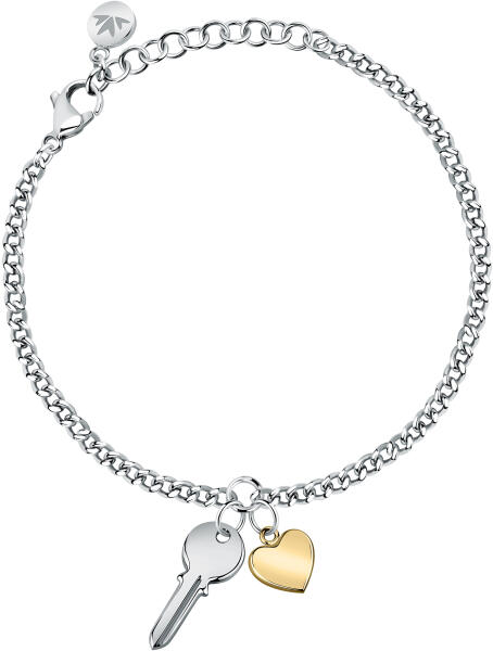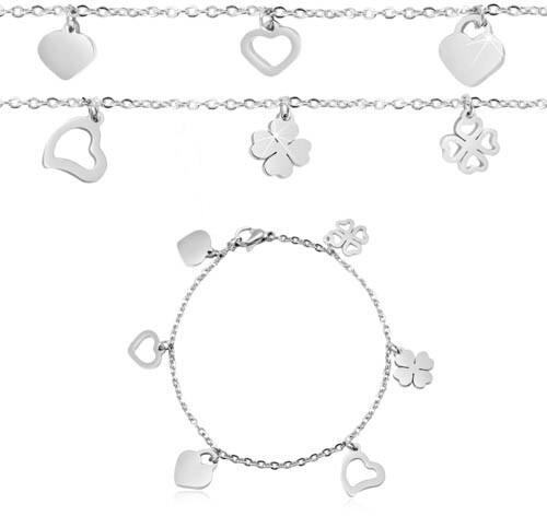 Acél karkötő ovális szemekből álló láncból, amelyen hat különböző medál függ - két teli szív, két szív körvonala, egy teli négylevelű lóhere és egy négylevelű lóhere körvonala. Delfinkapoccsal záródik. Szélesség: 1,9 mmHossz: 180 mmMedálok méretei: cca 11 x 11 mm