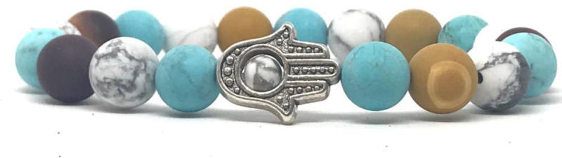 Egyedi ásvány karkötő Hamsa-védelmező kéz dísszel A 8mm-es Mokait, Türkiz és Howlit ásvány golyókból készült karkötő speciális gumis damilra van fűzve, Hamsa kéz díszítéssel. Amit a Howlit ásványról tudni kell: A howlitot Henry How-ról, egy 19-ik századi ásványkutatóról nevezték el, aki elsőkét talált rá erre a sokoldalú kőre. A howlit festetlenül matt feh