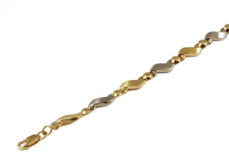 Klasszikus és igen kedvelt fazonú, helyenként mattítással és ródiummal díszített, hullám mintázatú szemekből álló, sárga arany karkötő.