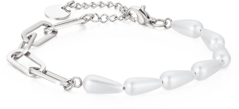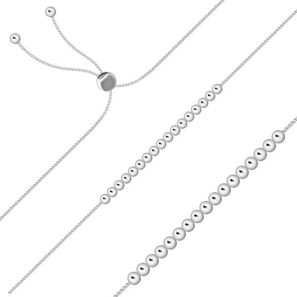 A 925 ezüstből készült karkötő egy apró, szögletes láncszemekből álló láncot jelent. A láncot sima, azonos méretű, tükörfényesre polírozott felületű gyöngyök díszítik. A karkötő hossza egy lapos gyűrű alakú csúszó gyöngy segítségével állítható. A díszítőelem mérete: 60 x 4 mm A lánc szélessége: 1,1 mm A karkötő maximális hossza: kb. 240 mm (+/- 5 %